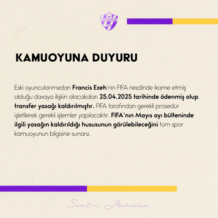 Eski oyuncularımızdan Francis Ezeh’nin FIFA nezdinde ikame etmiş olduğu davaya ilişkin alacakaları 25.04.2025 tarihinde ödenmiş olup, transfer yasağı kaldırılmıştır. FIFA tarafından gerekli prosedür işletilerek gerekli işlemler yapılacaktır. FIFA’nın Mayıs ayı bülteninde ilgili yasağın kaldırıldığı hususunun görülebileceğini tüm spor kamuoyunun bilgisine sunarız.