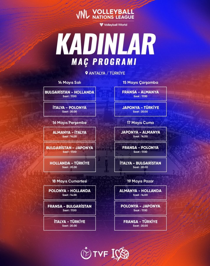 Son Milletler Ligi şampiyonu Filenin Sultanları'nın maç programı şu şekilde: