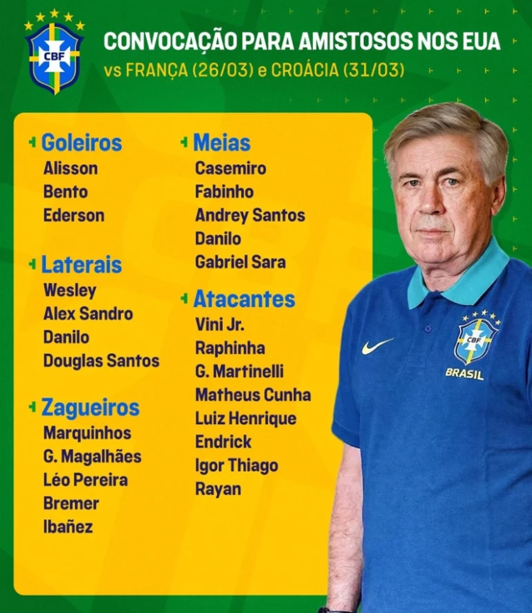 26 yaşındaki futbolcu, ilk kez milli takıma çağrıldı. Fenerbahçe'nin tecrübeli file bekçisi Ederson da kadroda yer aldı. Neymar ise, Brezilya’nın FIFA 2026 Dünya Kupası öncesindeki son hazırlık maçı kadrosuna dahil edilmedi.