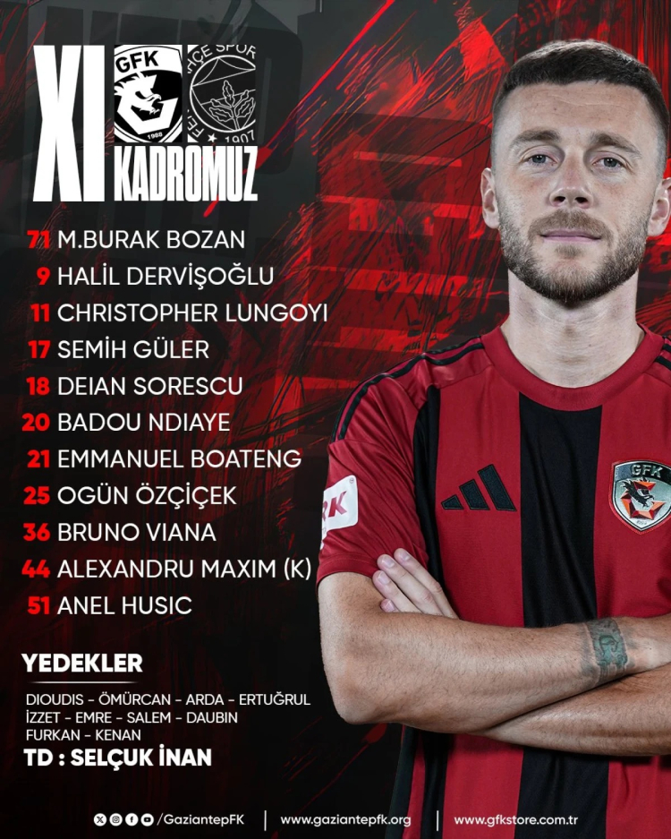 Gaziantep FK: Burak, Sorescu, Bruno, Semih, Anel, Badou, Ogün, Maxim, Halil, Lungoyi, Boateng