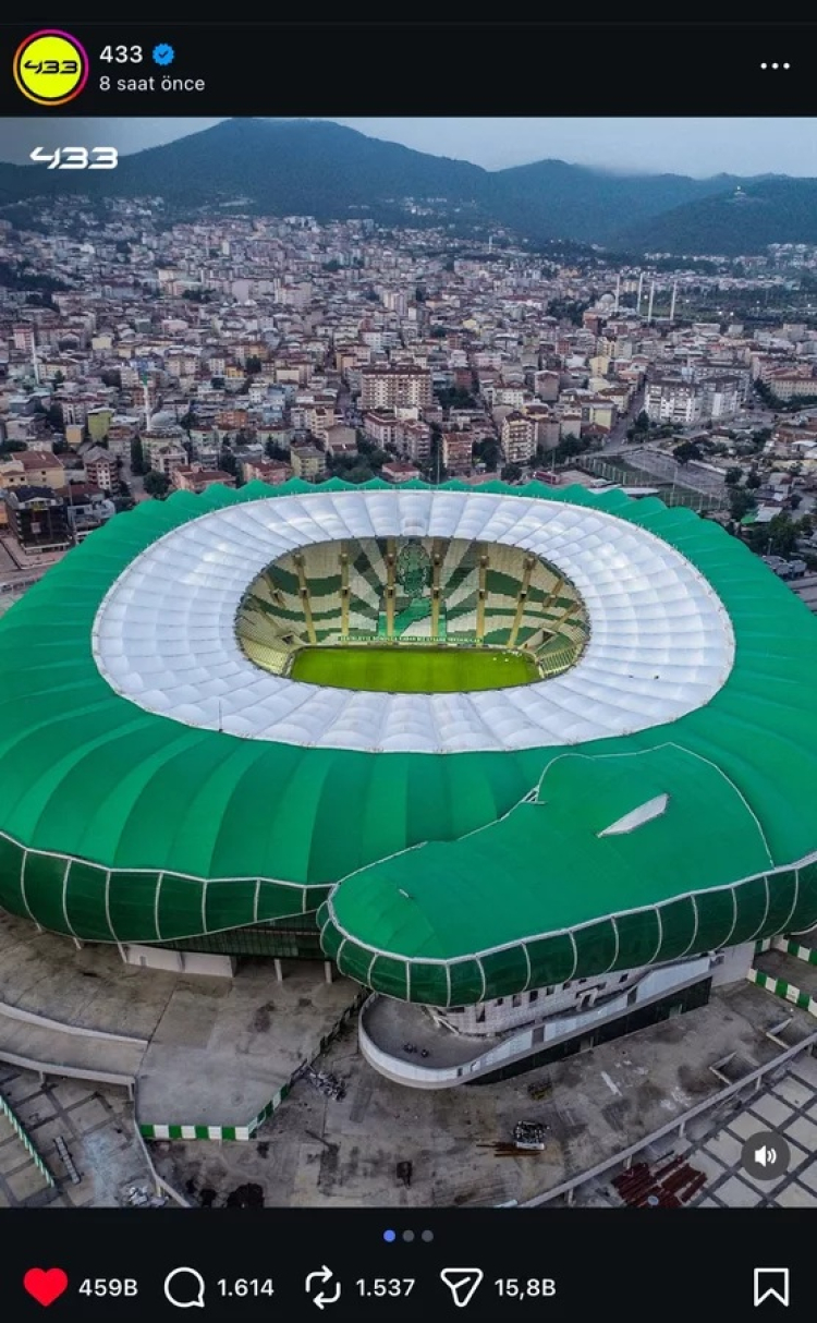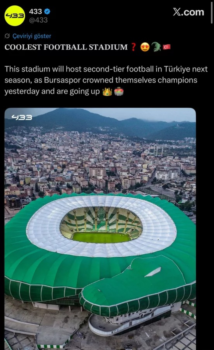 Timsah şekliyle görenlere adeta görsel şölen yaşatan Bursaspor'un evi Atatürk Spor Kompleksi Matlı Stadyumu yeniden dünya gündeminde yerini aldı. Instagram'da 77 milyon, X platformunda ise 6 milyon takipçisi bulunan 433, Bursaspor ile özdeşleşmiş Gökhan Kırdar'ın Cendere müziğiyle yaptığı paylaşımda stadyum mimarisini ve Bursaspor'un elde ettiği TFF 2. Lig şampiyonluğuna yer verdi.