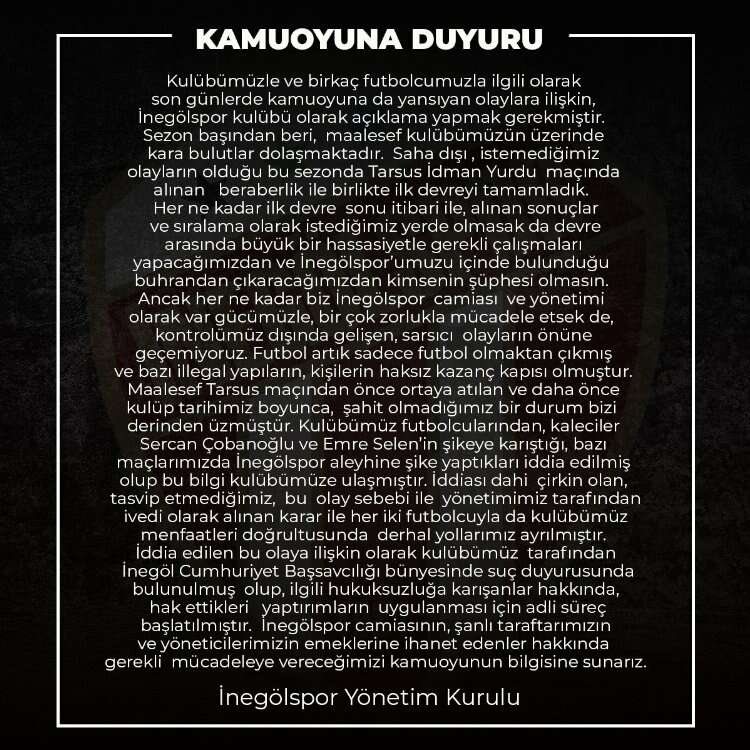 Ancak her ne kadar biz İnegölspor camiası ve yönetimi olarak var gücümüzle, bir çok zorlukla mücadele etsek de, kontrolümüz dışında gelişen, sarsıcı olayların önüne geçemiyoruz. Futbol artık sadece futbol olmaktan çıkmış ve bazı illegal yapıların, kişilerin haksız kazanç kapısı olmuştur. Maalesef Tarsus maçından önce ortaya atılan ve daha önce kulüp tarihimiz boyunca, şahit olmadığımız bir durum bizi derinden üzmüştür. Kulübümüz futbolcularından, kaleciler Sercan Çobanoğlu ve Emre Selen'in şikeye karıştığı, bazı maçlarımızda İnegölspor aleyhine şike yaptıkları iddia edilmiş olup bu bilgi kulübümüze ulaşmıştır. İddiası dahi çirkin olan, tasvip etmediğimiz, bu olay sebebi ile yönetimimiz tarafından ivedi olarak alınan karar ile her iki futbolcuyla da kulübümüz menfaatleri doğrultusunda derhal yollarımız ayrılmıştır. İddia edilen bu olaya ilişkin olarak kulübümüz tarafından İnegöl Cumhuriyet Başsavcılığı bünyesinde suç duyurusunda bulunulmuş olup, ilgili hukuksuzluğa karışanlar hakkında, hak ettikleri yaptırımların uygulanması için adli süreç başlatılmıştır. İnegölspor camiasının, şanlı taraftarımızın ve yöneticilerimizin emeklerine ihanet edenler hakkında gerekli mücadeleye vereceğimizi kamuoyunun bilgisine sunarız.