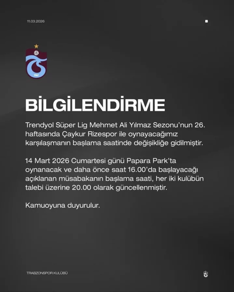Trabzonspor tarafından yapılan resmi açıklamada, "Trendyol Süper Lig Mehmet Ali Yılmaz Sezonu'nun 26. haftasında Çaykur Rizespor ile oynayacağımız karşılaşmanın başlama saatinde değişikliğe gidilmiştir. 14 Mart 2026 Cumartesi günü Papara Park'ta oynanacak ve daha önce saat 16.00'da başlayacağı açıklanan müsabakanın başlama saati, her iki kulübün talebi üzerine 20.00 olarak güncellenmiştir. Kamuoyuna duyurulur." ifadeleri kullanıldı
