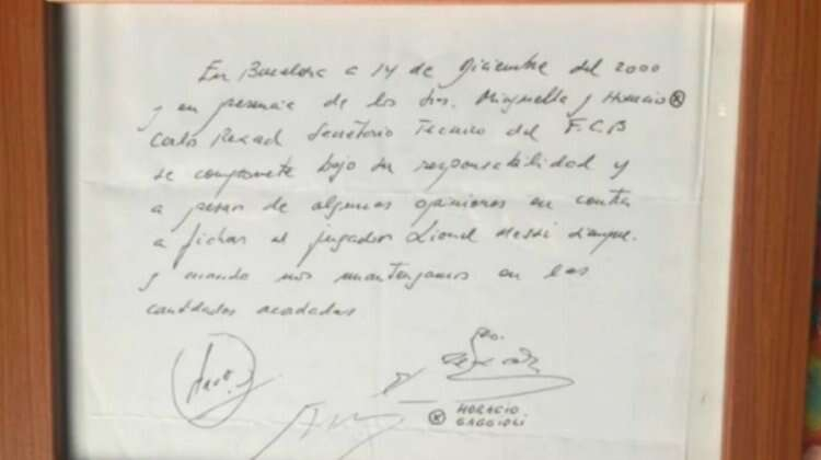 "Barselona'da, 14 Aralık 2000 tarihinde ve Messrs Minguella ve Horacio'nun huzurunda, FC Barcelona'nın sportif direktörü Carles Rexach, kendi sorumluluğu altında ve herhangi bir karşı görüşe bakılmaksızın, işbu belgeyle şunu kabul eder: Üzerinde anlaşılan miktarlara uymamız şartıyla, Lionel Messi ile sözleşme imzalayacağız."