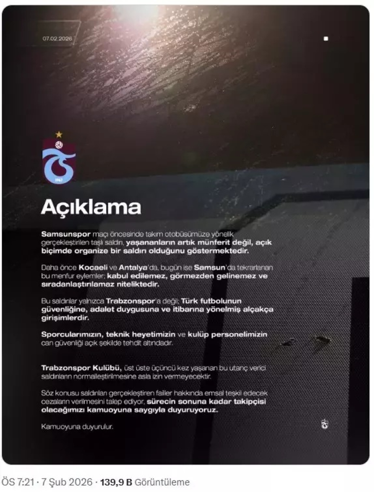 Bu saldırılar yalnızca Trabzonspor'a değil; Türk futbolunun güvenliğine, adalet duygusuna ve itibarına yönelmiş alçakça girişimlerdir. Sporcularımızın, teknik heyetimizin ve kulüp personelimizin can güvenliği açık şekilde tehdit altındadır. Trabzonspor Kulübü, üst üste üçüncü kez yaşanan bu utanç verici saldırıların normalleştirilmesine asla izin vermeyecektir.