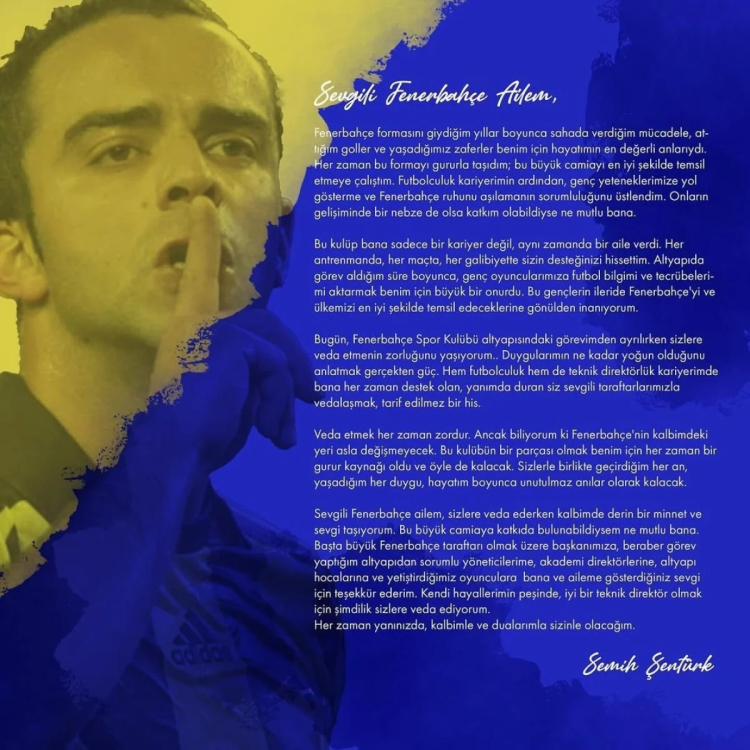 Bugün, Fenerbahçe Spor Kulübü altyapısındaki görevimden ayrılırken sizlere veda etmenin zorluğunu yaşıyorum.. Duygularımın ne kadar yoğun olduğunu anlatmak gerçekten güç. Hem futbolculuk hem de teknik direktörlük kariyerimde bana her zaman destek olan, yanımda duran siz sevgili taraftarlarımızla
