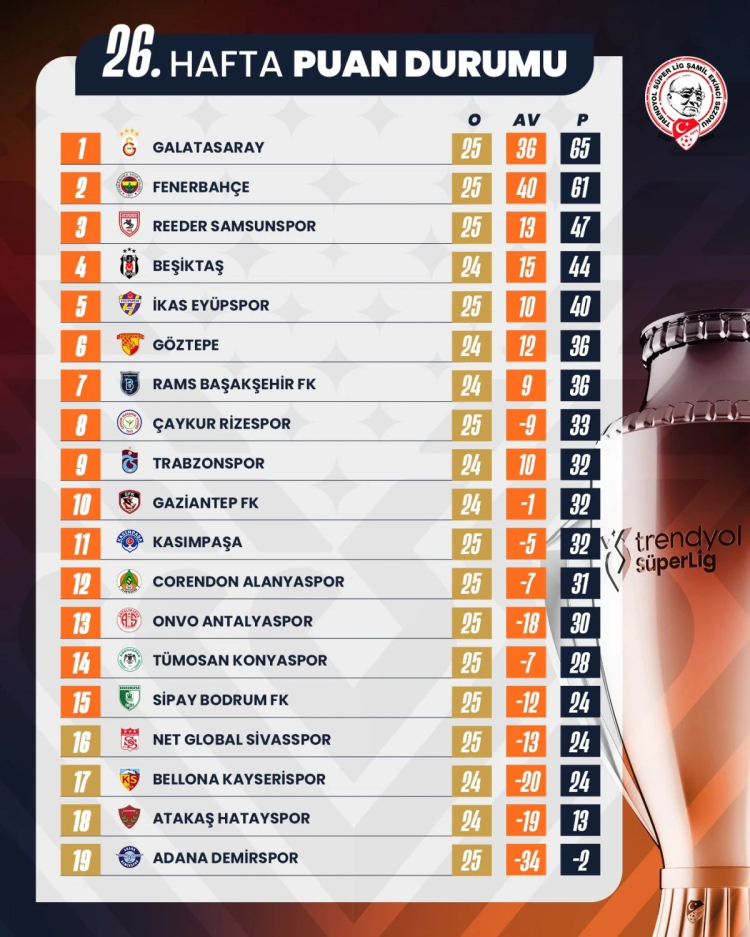 Süper Lig'de 26. haftanın ardından oluşan puan durumu ve 27. haftanın fikstürü
