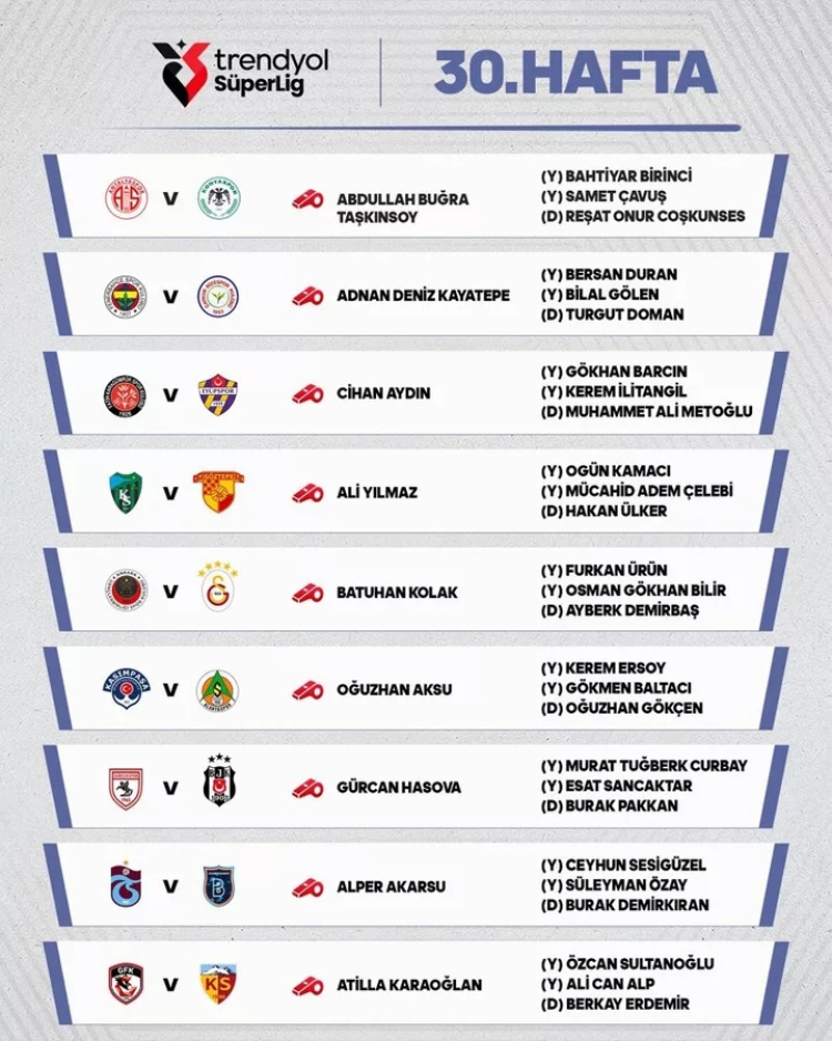 Süper Lig'in 30. haftasında oynanacak olan karşılaşmalarda görev yapacak hakemler açıklandı.