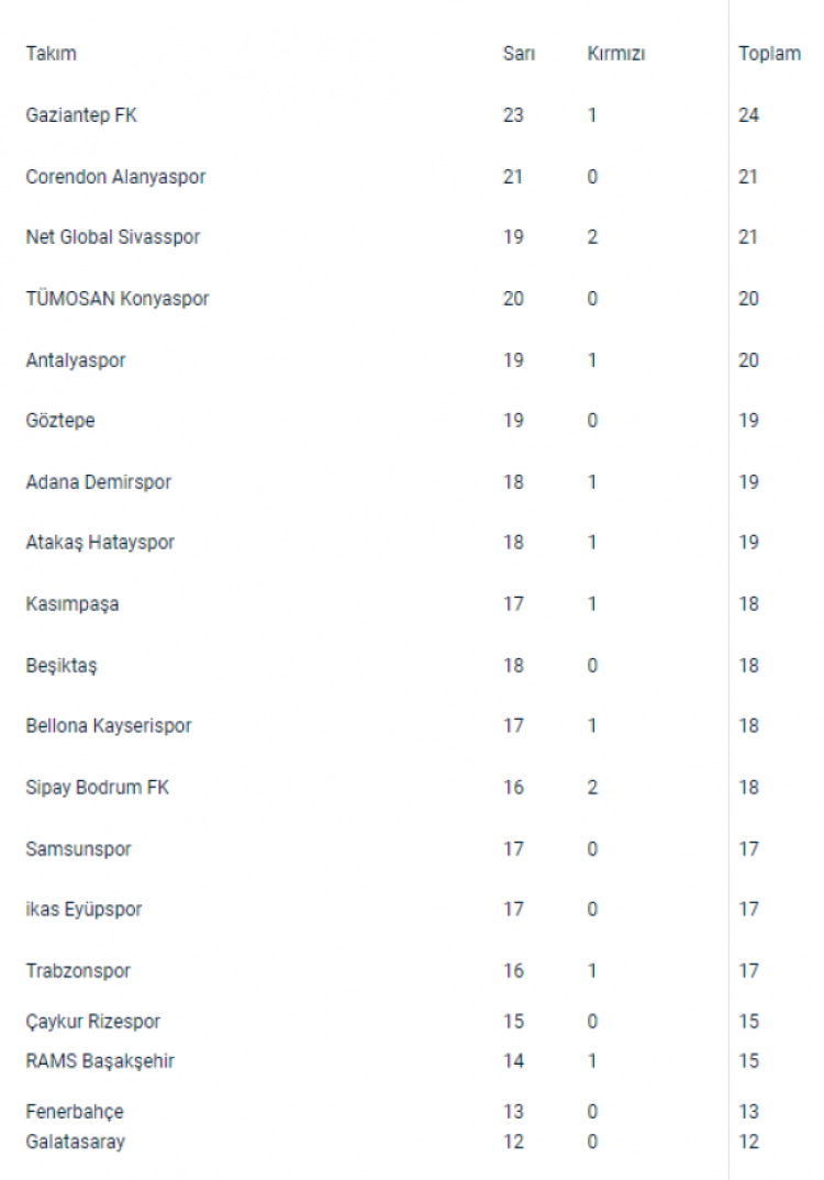 Trendyol Süper Lig'in geride kalan 8 haftasında en çok kart gören takımların listesinde Gaziantep FK 24 kart ile ilk sırada yer aldı.
