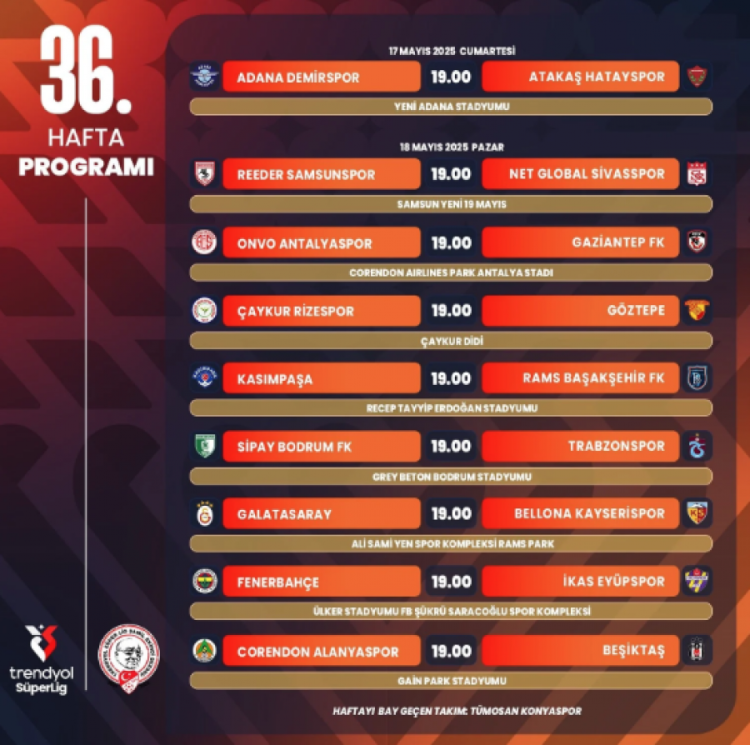 TFF'den yapılan açıklamada, "Trendyol Süper Lig Şamil Ekinci Sezonu'nda 36. hafta müsabakalarına ilişkin program açıklanmıştır. Daha önceki sezonlarda olduğu gibi ligin son 3 haftasında birbirini ilgilendiren maçlar aynı gün ve saatlerde oynatılacaktır." denildi.