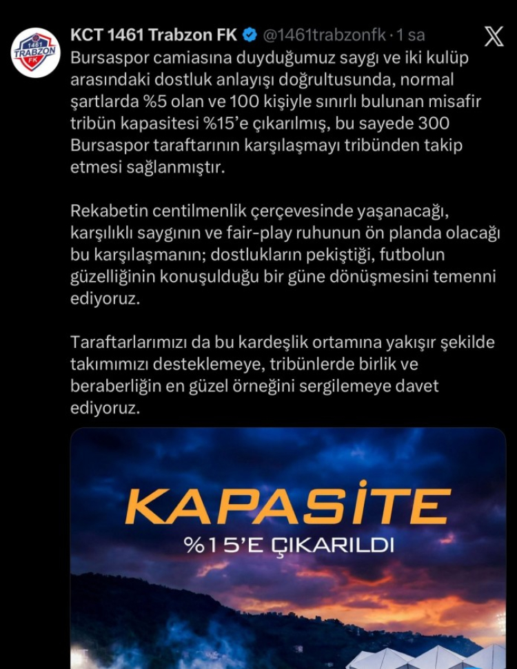 1461 Trabzon FK, yaptığı açıklamada birlik ve beraberlik vurgusuyla Bursaspor taraftarlarına özel misafir tribün kapasitesinin yüzde 15 artırıldığını açıkladı. Trabzon FK yaptığı açıklamada, "Bursaspor camiasına duyduğumuz saygı ve iki kulüp arasındaki dostluk anlayışı doğrultusunda, normal şartlarda %5 olan ve 100 kişiyle sınırlı bulunan misafir tribün kapasitesi %15'e çıkarılmış, bu sayede 300 Bursaspor taraftarının karşılaşmayı tribünden takip etmesi sağlanmıştır. Rekabetin centilmenlik çerçevesinde yaşanacağı, karşılıklı saygının ve fair-play ruhunun ön planda olacağı bu karşılaşmanın; dostlukların pekiştiği, futbolun güzelliğinin konuşulduğu bir güne dönüşmesini temenni ediyoruz. Taraftarlarımızı da bu kardeşlik ortamına yakışır şekilde takımımızı desteklemeye, tribünlerde birlik ve beraberliğin en güzel örneğini sergilemeye davet ediyoruz" ifadelerini kullandı.