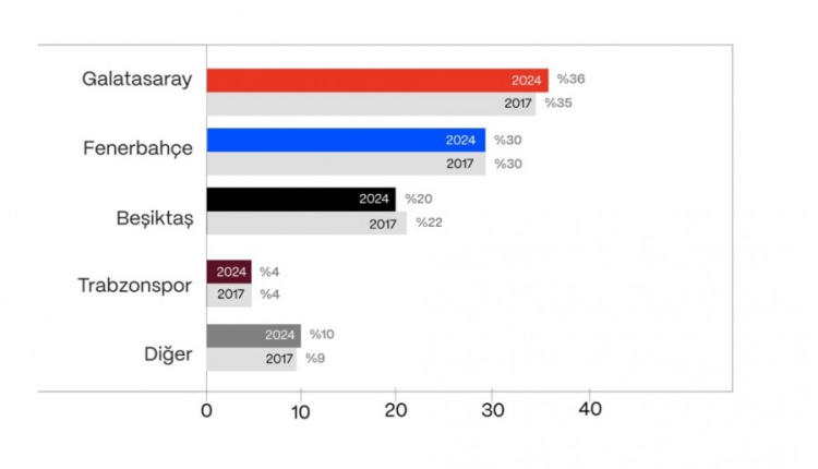 Fenerbahçe, taraftar oranında değişiklik göstermedi. 2017'de olduğu gibi 2024'te de yüzde 30 oranıyla listenin ikinci sırasında yer aldı.