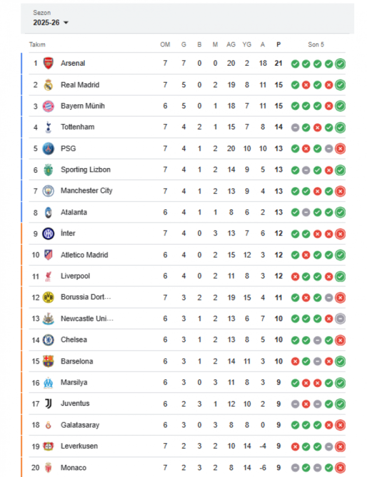 Milli yıldızımız Arda Güler'in formasını giydiği Real Madrid, topladığı 15 puanla puan tablosunda 2. sırada yer alıyor. İspanyol devini, Hakan Çalhanoğlu'nun kaptanlığını yaptığı Inter 12 puanla 9. sıradan takip ediyor. Temsilcimiz Galatasaray 9 puanla 18. sırada yer alırken, milli oyuncumuz Kenan Yıldız'ın takımı Juventus ise 9 puanla 17. sırada bulunuyor.
