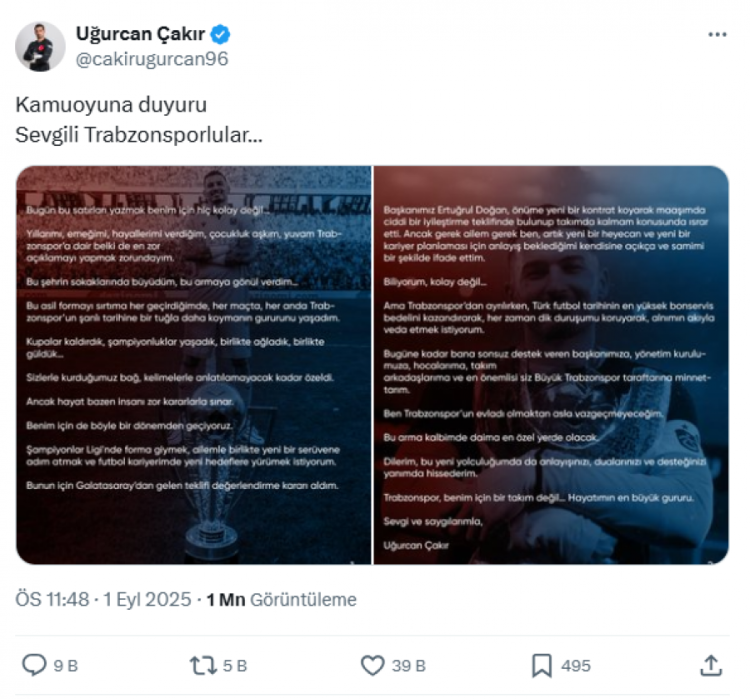 Trabzonspor'un milli kalecisi Uğurcan Çakır, Galatasaray'dan gelen teklifi değerlendirmeye aldığını sosyal medya hesabından açıkladı.
