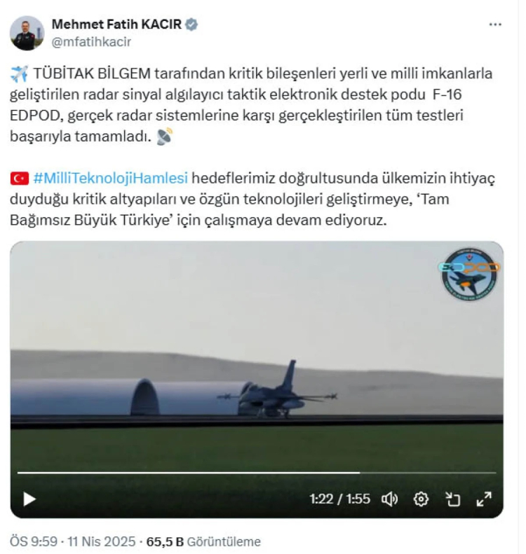 Sanayi ve Teknoloji Bakanı Mehmet Fatih Kacır, sosyal medya hesabı üzerinden yaptığı açıklamada, TÜBİTAK BİLGEM tarafından yerli ve milli imkanlarla geliştirilen radar sinyal algılayıcı taktik elektronik destek podu F-16 EDPOD'un, gerçek radar sistemlerine karşı yapılan tüm testleri başarıyla geçtiğini belirtti. Bakan Kacır, "Milli teknoloji hamlesi doğrultusunda ülkemizin ihtiyaç duyduğu kritik altyapıları ve özgün teknolojileri geliştirmeye devam ediyoruz. Tam bağımsız büyük Türkiye hedefiyle çalışmalarımıza hız kesmeden devam ediyoruz" ifadelerini kullandı.