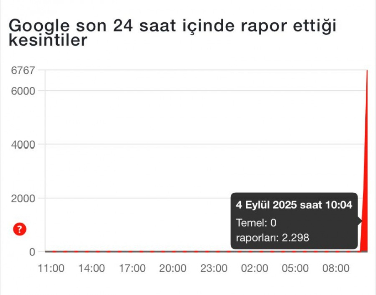 Sosyal medya ve internet kesinti raporlayıcısı DownDetector, Google'daki kesintiye ilişkin 4 Eylül 2025 saat 10.04 itibariyle tam 2 bin 298 kesinti raporu kaydetti.