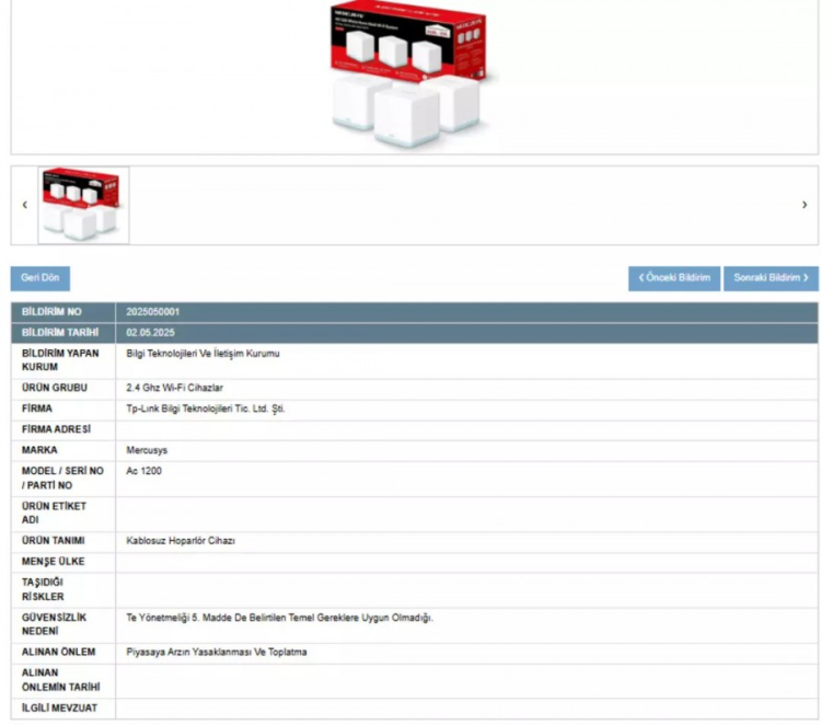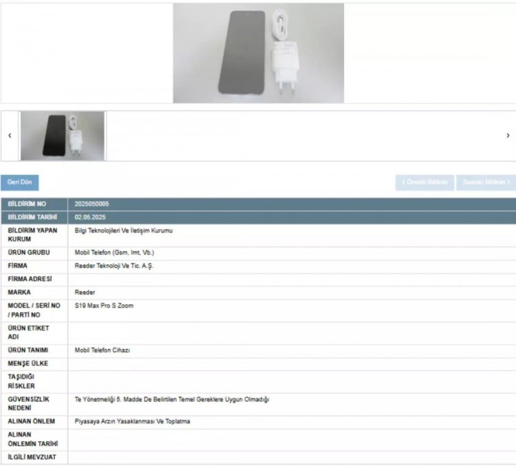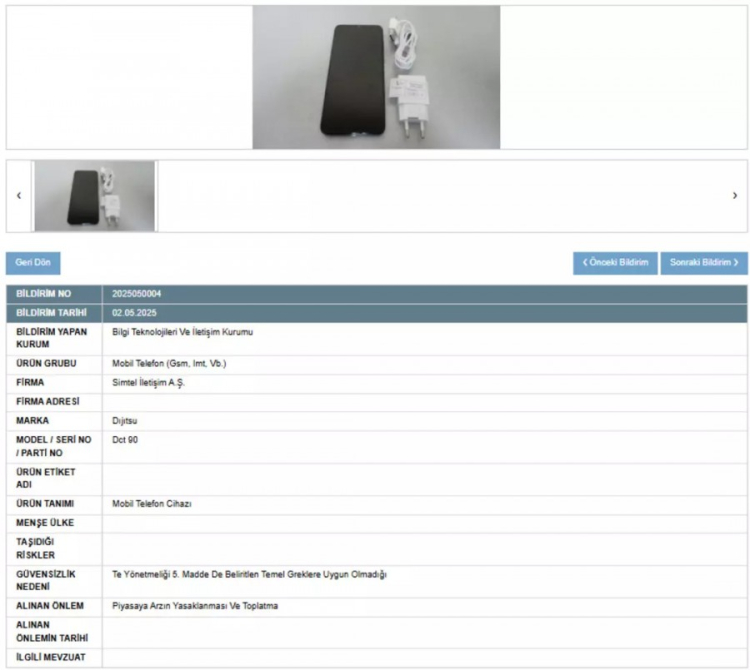 Bakanlık üründe, "Te Yönetmeliği 5. Madde De Belirtilen Temel Gereklere Uygun Olmadığı" tespitinde bulundu ve modelin piyasa arzının yasaklanıp toplatılmasına karar verildi.