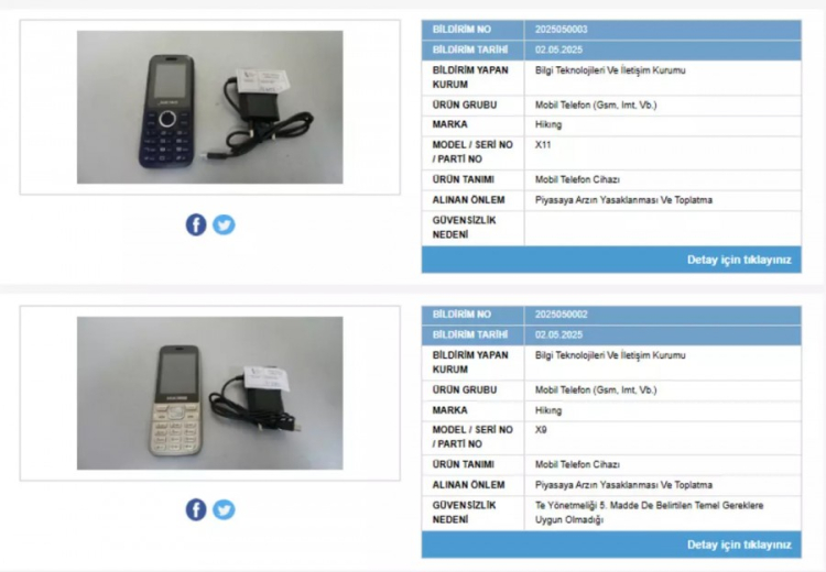 Sİmtel firmasına ait olan Hiking marka tuşlu telefonda da, "Te Yönetmeliği 5. Madde De Belirtilen Temel Gereklere Uygun Olmadığı" ifadeleri kullanıldı ve ürünün toplatılıp arzının yasaklanmasına karar verildi. Aynı markanın X11 modelinde de aynı sorun tespit edildi.