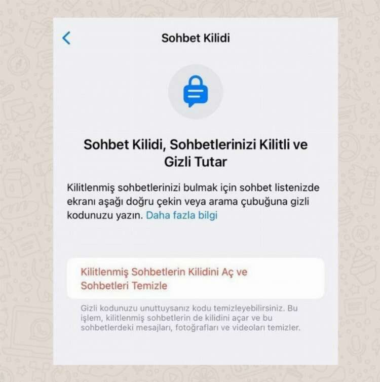 Gizli kodunuzu unuttuğunuzda sohbetlerin arşivinizde kalmasını istemiyorsanız tüm mesajları toplu silmenizi sağlayan bu özelliğe tıklayabilirsiniz.