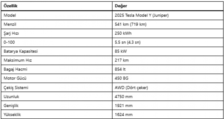Tesla, Model Y'nin önceki versiyonunda 531 kilometrelik bir menzil sunarken, yenilenen model bu rakamı yaklaşık 10 kilometre artırarak 541 kilometreye çıkardı.