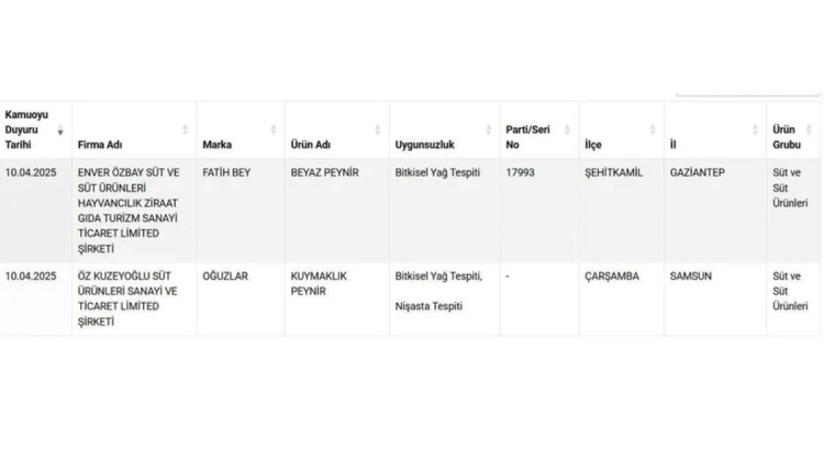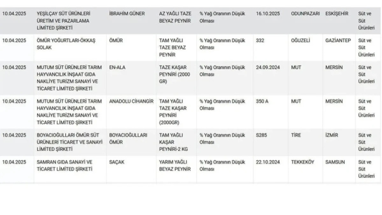 Yapılan denetimler sonucunda 2 peynir markasının içeriğinde bitkisel yağ tespit edilirken 8 peynir markasının peynirlerinin yağ oranlarının olması gerekenden düşük olduğu ortaya çıktı. İşte, listeye eklenen yeni peynir markaları: