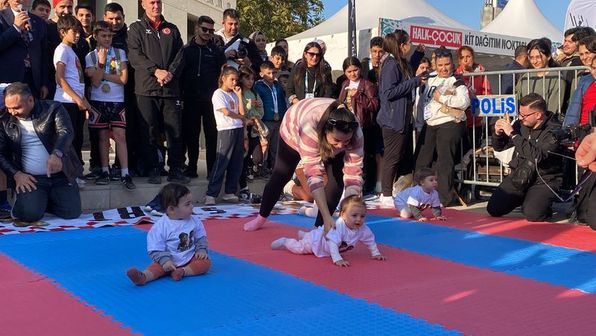 Osmaniye'de Uluslararası Yarı Maraton etkinlikleri kapsamında Devlet Bahçeli Meydanı'nda kurulan parkurda yapılan bebek emekleme yarışında minikler ailelerine ulaşmak için yarıştı; startı Başkan İbrahim Çenet verdi, tüm katılımcılara bisiklet hediye edildi