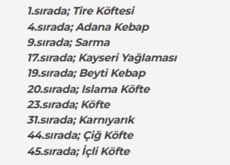 Dünya mutfağını derecelendiren TasteAtlas, 2025 yılına ait "En İyi 100 Kıyma Yemeği" listesini açıkladı. Listenin birincisi Türkiye'den çıktı. İzmir'in Tire ilçesine özgü şiş köfte, uluslararası arenada damakları fethederek zirveye yerleşti.Türk mutfağının sevilen tatları listede geniş yer buldu. Tire şiş köftenin yanı sıra Adana kebap, İskender kebap, içli köfte, sarma, Kayseri yağlaması, Beyti kebap ve Islama köfte gibi geleneksel lezzetler de sıralamada yer aldı.