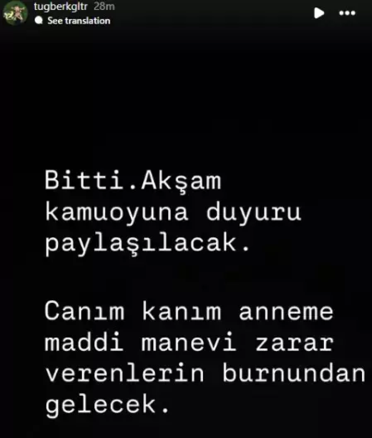 Tuğberk Yağız Gülter, paylaşımında, "Bitti. Akşam kamuoyuna duyuru paylaşılacak. Canım kanım anneme maddi manevi zarar verenlerin burnundan gelecek" ifadelerini kullandı.