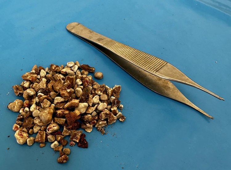 Önce bir tarafı temizledik, çok zahmetli olacak diye esas büyük olanı sona bıraktık. Bir seansta bir tarafı temizledikten sonra araya bir süre koyduk, hasta iyileşti. İkinci seansta da 5 santimlik olan taş kısmını boşalttık. Tek tek taşları toplamak yaklaşık 4 saate yakın süren zorlu, çetin ameliyat oldu. Bu büyüklükte bir taş görüyorsak genellikle bu taşlar tek parça halinde olur. Biz onları kırarak küçültürüz. Boncuk tanesi gibi küçük yüzlerce taşı bir arada görmek bizim için de deneyim oldu.