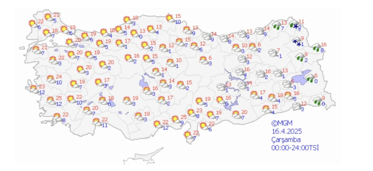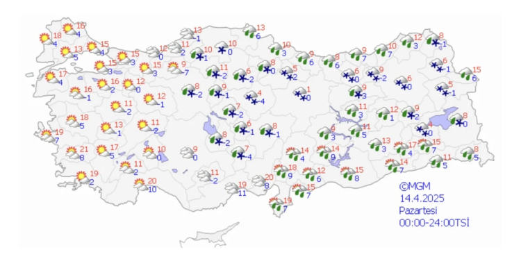 İç Anadolu (Konya ve Eskişehir hariç), Batı ve Orta Karadeniz, Doğu Anadolu, Güneydoğu Anadolu’nun kuzey ve doğusu ile Sakarya, Giresun, Trabzon, Antalya’nın doğu ilçeleri, Hatay, Kahramanmaraş, Gaziantep ve Kilis çevreleri ve Osmaniye’nin doğu kesimleri yağışlı geçecek.