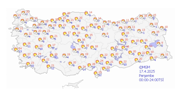 Bazı illerde beklenen hava durumuyla günün en yüksek sıcaklıkları ise şöyle: