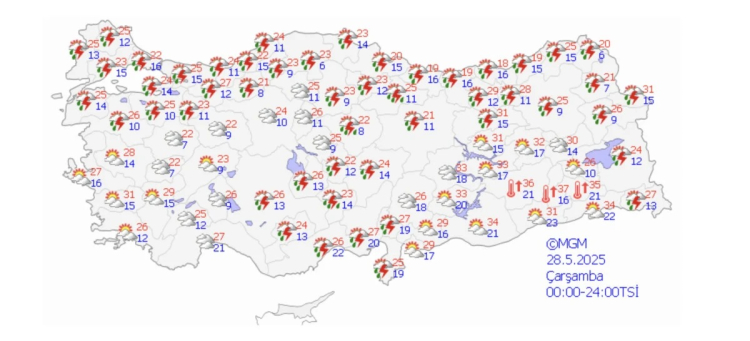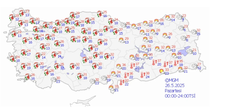 Meteoroloji Genel Müdürlüğü'nden alınan son bilgilere göre; 26 Mayıs 2025 tarihinde beklenen gök gürültülü sağanak yağış ve fırtına nedeniyle; 38 ilimiz için sarı uyarı verilmiştir.