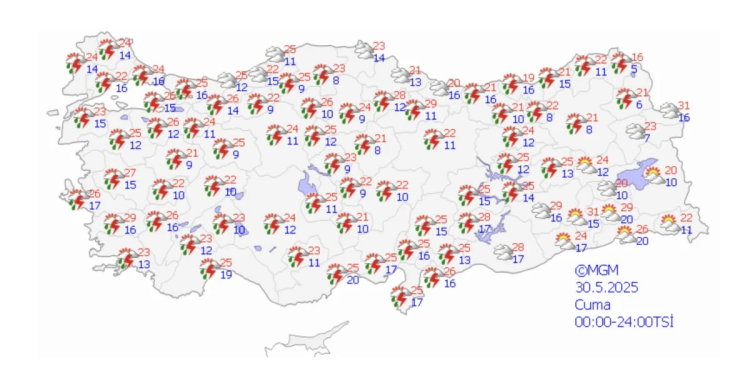 Özellikle Türkiye genelinin parçalı ve az bulutlu, yer yer çok bulutlu, Marmara, Ege, İç Anadolu'nun batısı ile Burdur, Isparta, Düzce, Bolu, Karabük ve Hakkari çevrelerinin aralıklı sağanak ve gök gürültülü sağanak yağışlı geçeceği tahmin ediliyor.