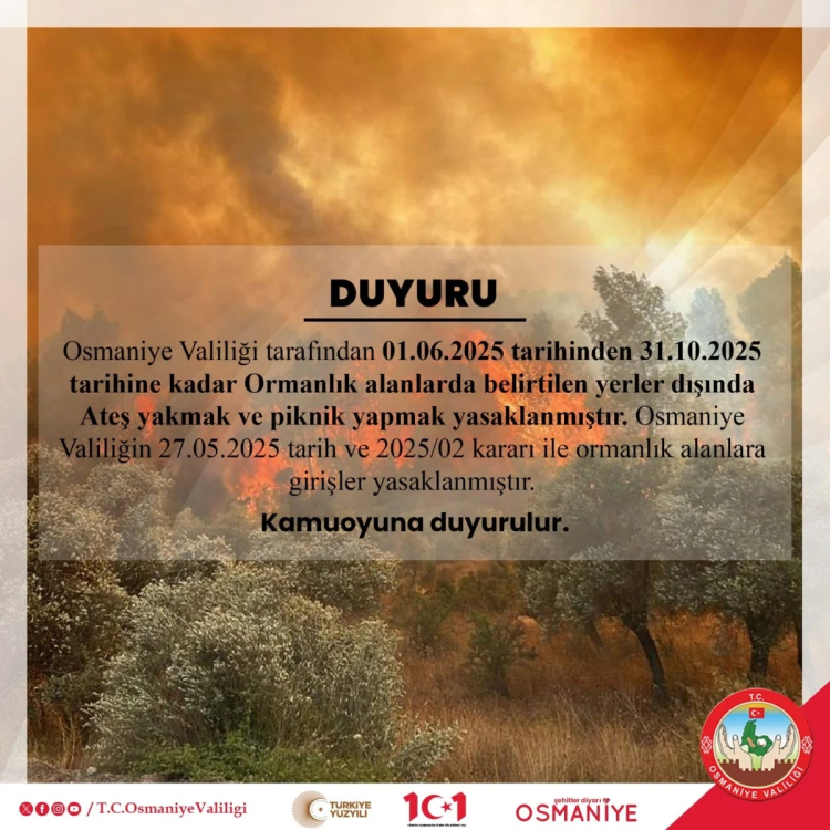Osmaniye Valiliğinden yapılan açıklamada, Karacalar A tipi Mesire Yeri (Seyirtepe), Olukbaşı A Tipi Mesire Yeri, Kent Ormanı (Ergenekon Meydanı), Park Orman, Zorkun Şenlik Tepesi C Tipi Mesire Yeri, Karanlıkdere C Tipi Mesire Yeri, Çiftmazı Tabiat Parkı, Sumbas-Kokar C Tipi Mesire Yeri, Savrun- Kokar C Tipi Mesire Yeri, Kadirli Taputepesi B Tipi Mesire Yeri, Karatepe-Aslantaş Milli Park alanları dışındaki Osmaniye il sınırları içinde bulunan tüm ormanlara giriş çıkışlar, orman yangını riskleri dolayısıyla yasaklandığı belirtildi.
