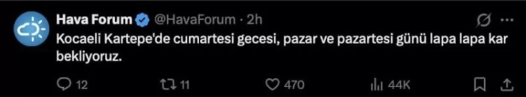 Hava Forum, paylaşımında, "Kocaeli Kartepe'de cumartesi gecesi, pazar ve pazartesi günü lapa lapa kar bekliyoruz." ifadelerini kullandı.
