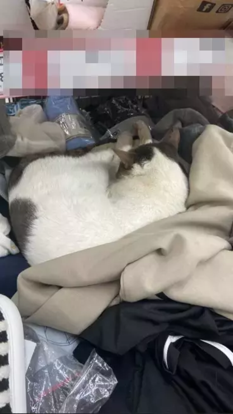 Reyondaki kıyafetlerin arasına girerek uyuyan sokak kedisi, bir müşteri tarafından cep telefonuyla görüntülendi. Kıyafetlerin üzerinde uyuyan kedinin görüntüleri kısa sürede yayılarak binlerce yorum aldı.
