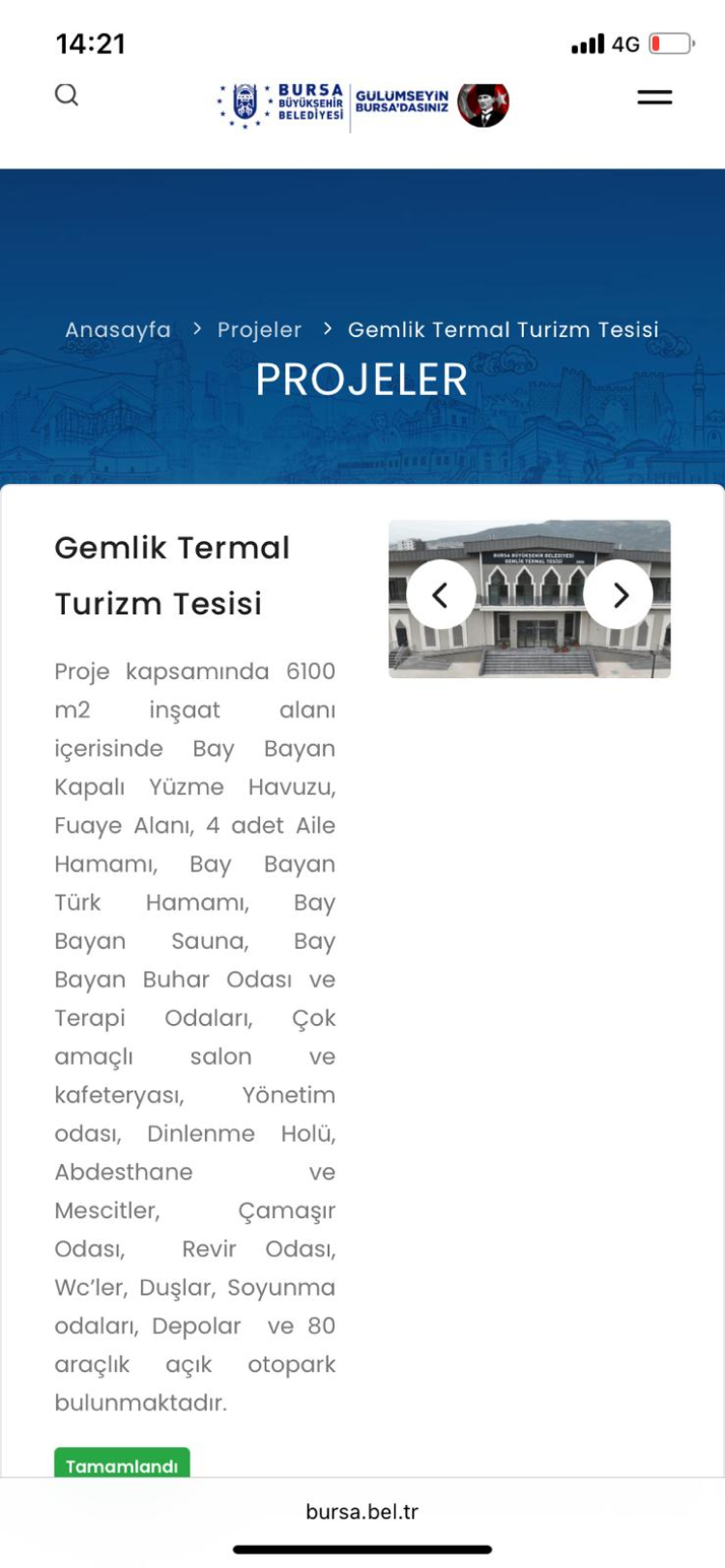 Bu gördüğünüz kare Bursa Büyükşehir Belediyesi'nin resmi internet sitesinde özellikle 'tamamlandı' vurgusuyla yer alıyor ve de bitmiş projeler arasında gösteriliyor.Bu da şu demek oluyor Mustafa Bozbey yönetimindeki Bursa Büyükşehir Belediyesi destekli hizmete dönüştürülen projeler arasında devasa bir yatırım olarak Gemlik Termel Turizm Tesisi yer bulmuş ve ilçeye kazandırılmış olarak gözüküyor.