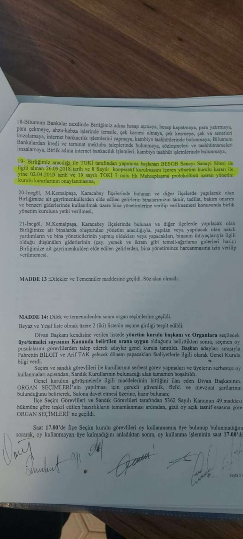 “19. madde ; Birliğimiz aracılığı ile TOKİ tarafından yapımına başlanan BESOB Sanayi Sitesi ile ilgili alınan 26.09.2018 tarih ve 8 sayılı kooperatif kurulmasını içeren yönetim kurulu kararı ile yine 02. 04.2019 tarih ve 19 sayılı TOKİ 7. Nolu ek mahsuplaşma protokolünü içeren yönetim kurulu kararının onaylanmasına……. “